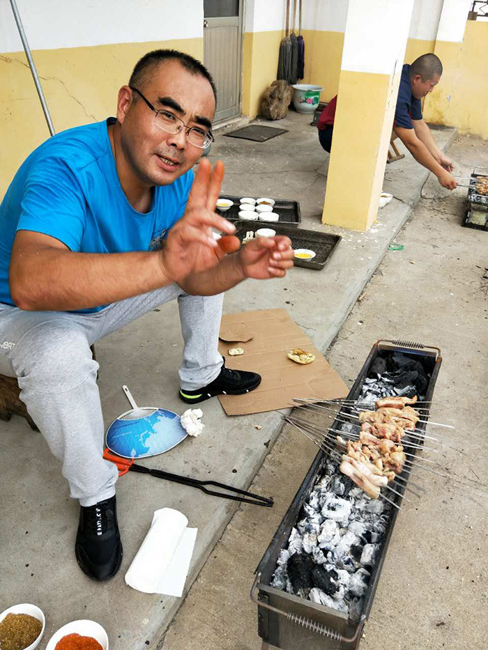 ↓這位老師傅,在等著徒弟烤好了孝敬自己,神情略微有些焦急和不滿:烤的真慢……一瓶水都見(jiàn)底了,還沒(méi)吃上肉!