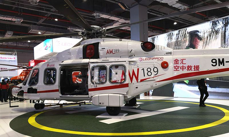 意大利萊奧納多AW189直升飛機:最新的高性能超中型雙發(fā)直升機,最大起飛重量8.6噸,配有兩臺帶有FADEC的GE CT7-2E1大功率渦軸發(fā)動機??团撟疃嗫纱畛?0人,滿載最大巡航速度287公里每小時,最大燃油量超過2噸,最大航程超1000公里。