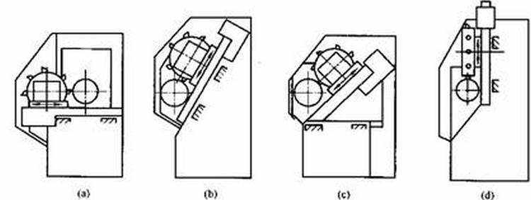 數(shù)控車床床身導(dǎo)軌與水平面的相對位置如圖1所示,它有4種布局形式:圖1(a)平床身,圖1(b)斜床身,圖1(c)平床身斜滑板,圖1(d)為立床身。